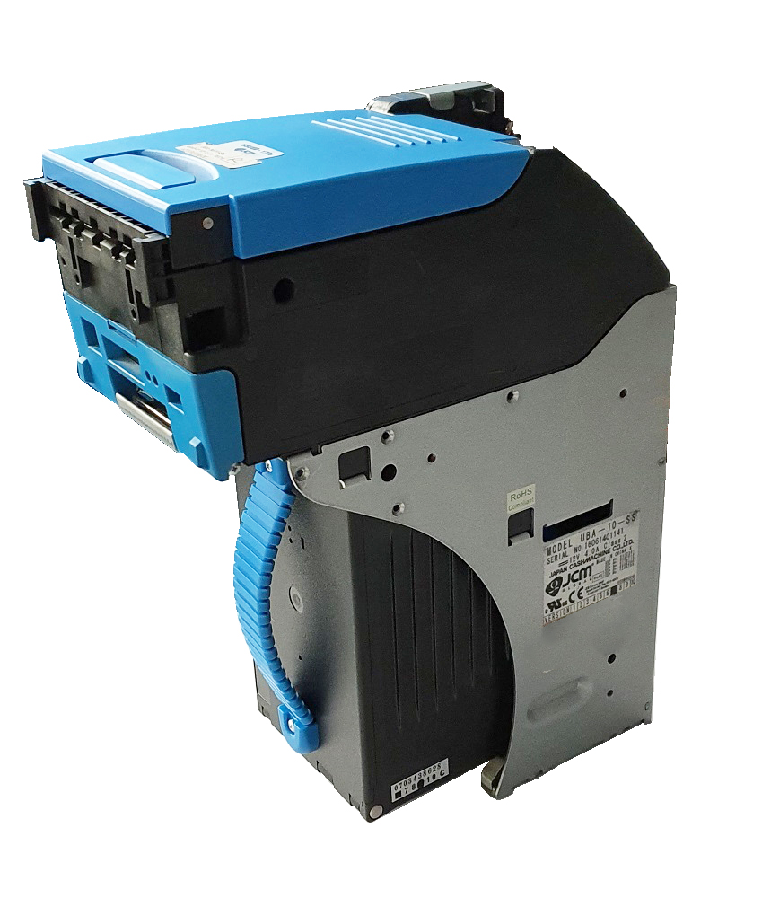 Used JCM UBA 10-SS bill acceptors including heads, cashboxes, and chassis.