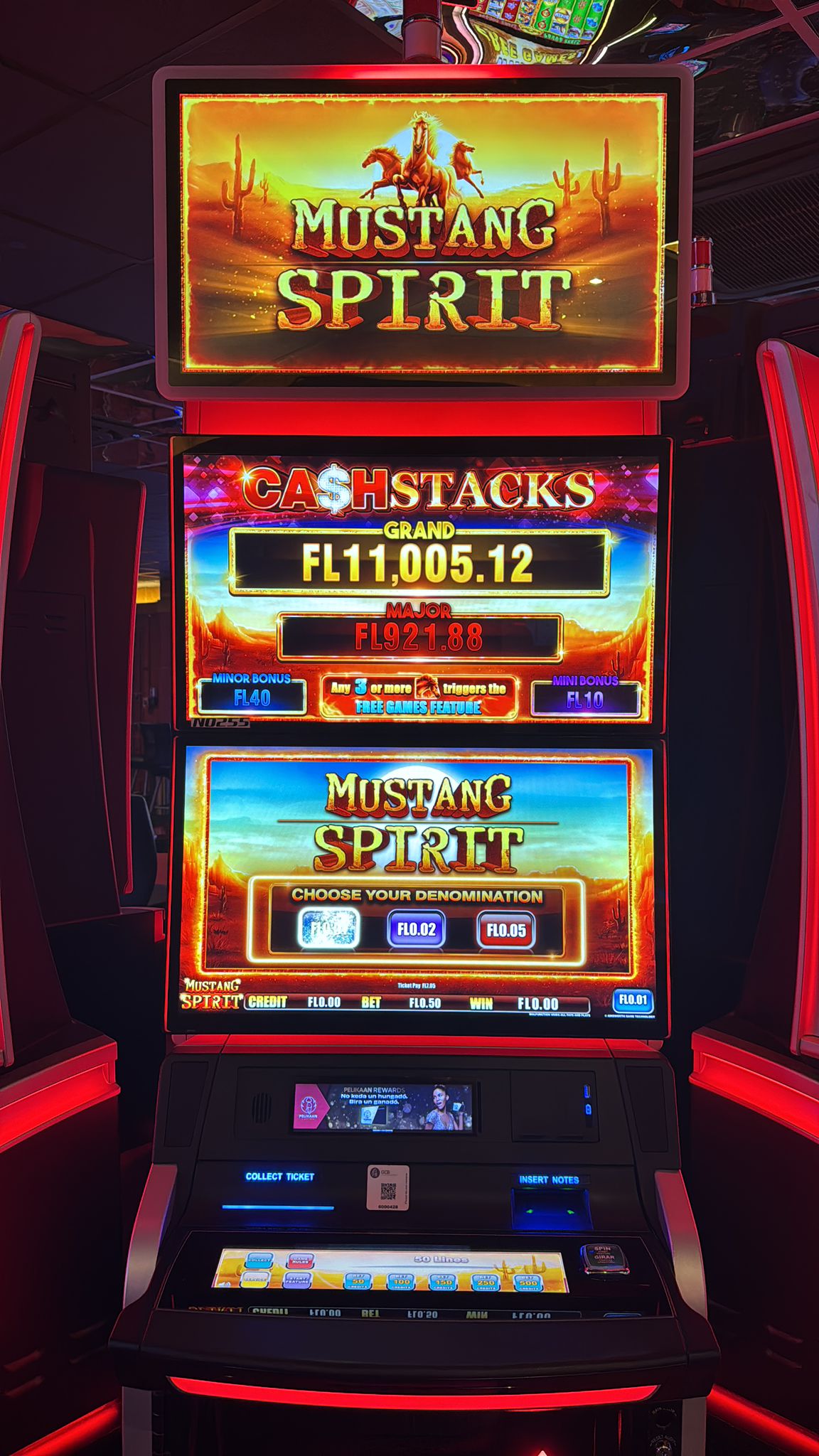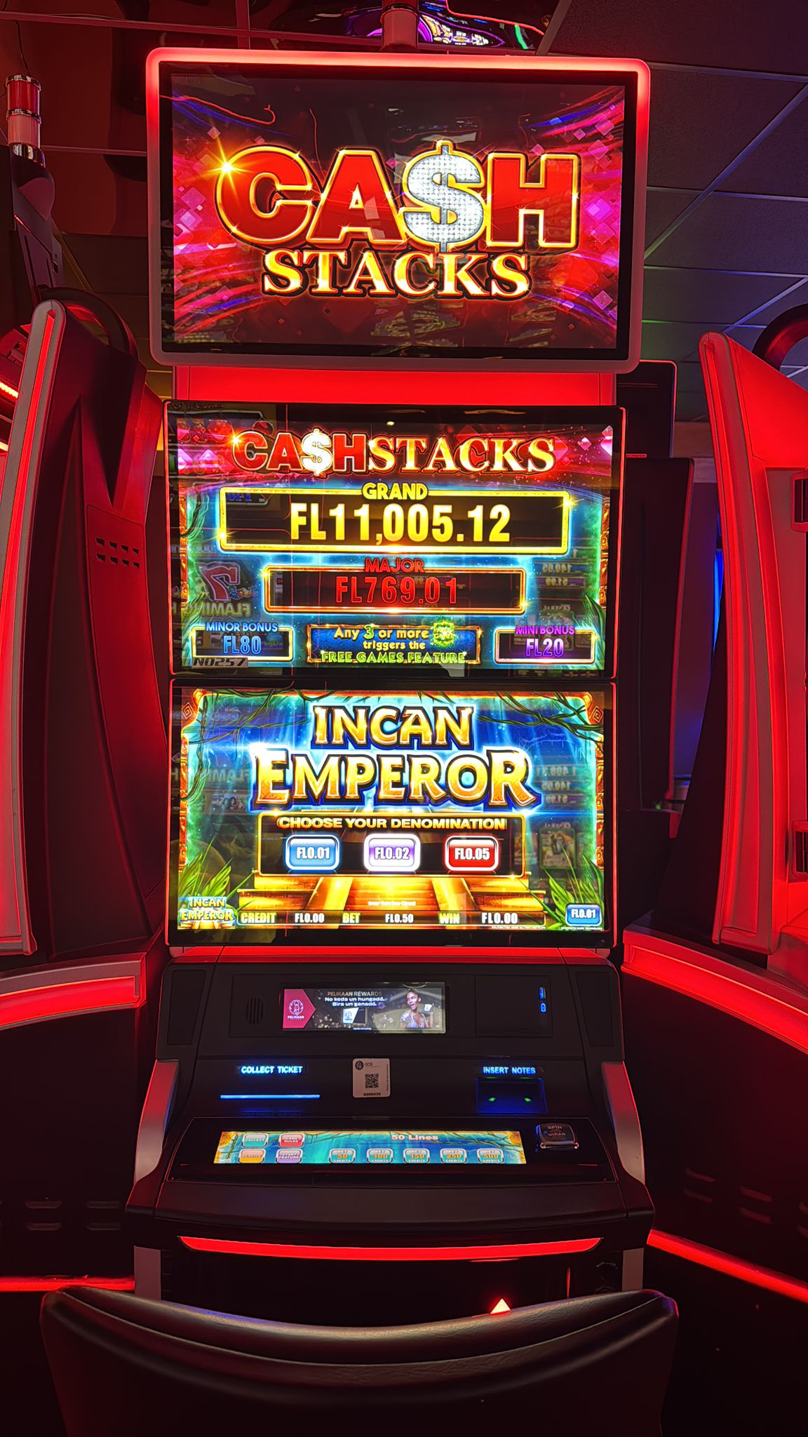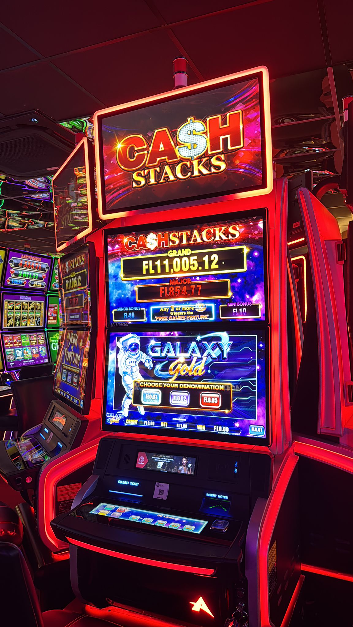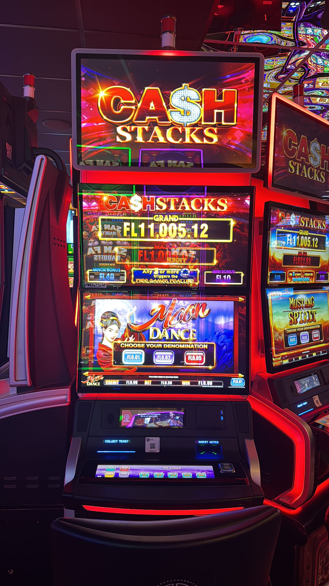 Set of 6 Ainsworth A727 (A-Star Dual) upright cabinets featuring two 27" screens plus a topper with dynamic LED edge lighting. Machines come with the Cash Stacks progressive featuring a mix of standalone games, including Action Dragons, Moon Dance, Mustang Spirit, Galaxy Gold, Incan Emperor, and Year of Fortune.